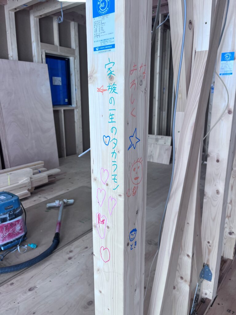 皆の夢を詰め込んだ宝箱の様なお家になるように!家族全員で柱に思い思いの気持ちを綴ったお家!