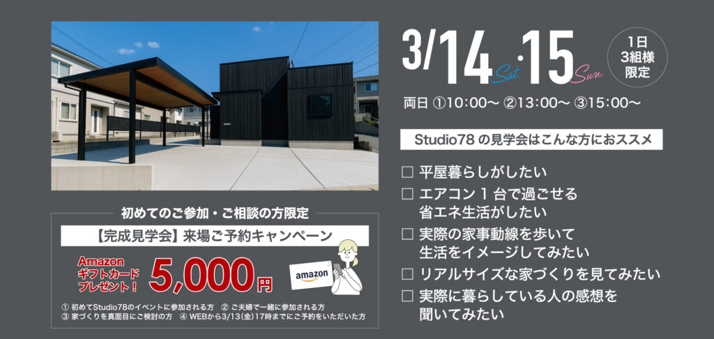 見学会へ行くには予約が必要ですか?Studio78の完成見学会は、完全予約制となっております。以下の予約ボタンより予約フォームにご記入の上、ご参加ください。