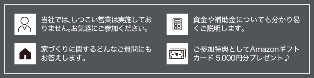 見学会後、しつこい営業をかけられることはありますか?完成見学会の際には、お引渡し前のお客様の大事なお家をお借りするので必ずアンケートにお名前・ご住所・ご連絡先をご記入頂いております。ただし、突然の自宅訪問やしつこい電話営業などは一切行っておりませんので、ご安心下さい。