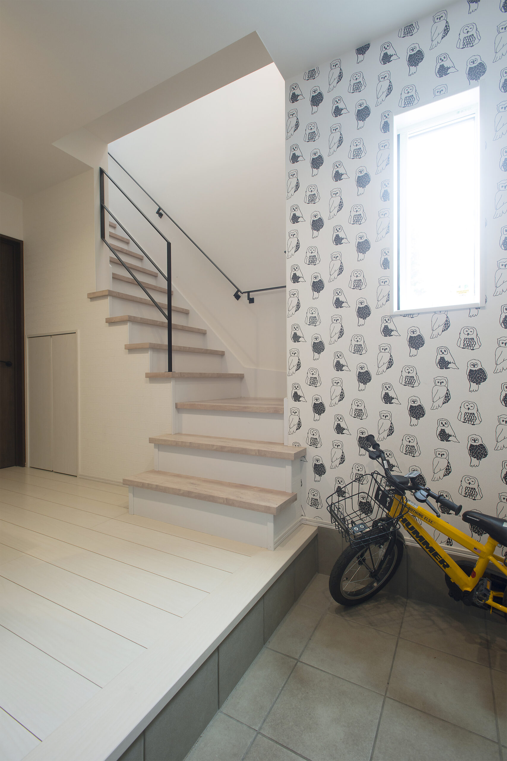アクセントウォールや黒のアイアン手すりが玄関ホールのアクセントに。左手には土間つづきのシューズクロークも