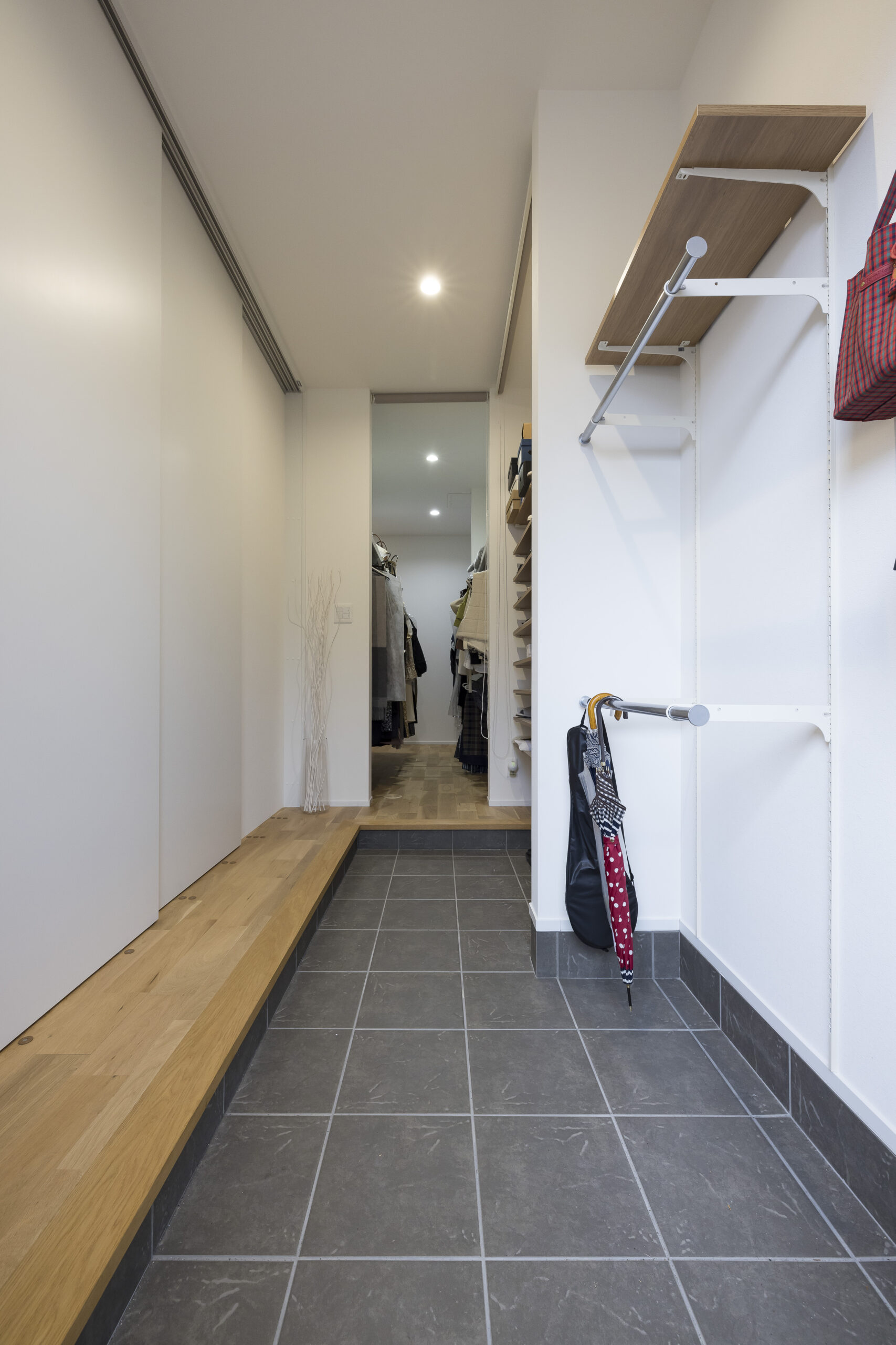 横玄関にウォークスルー型ファミリークローゼットを設け、外出時や帰宅時の動線を快適に