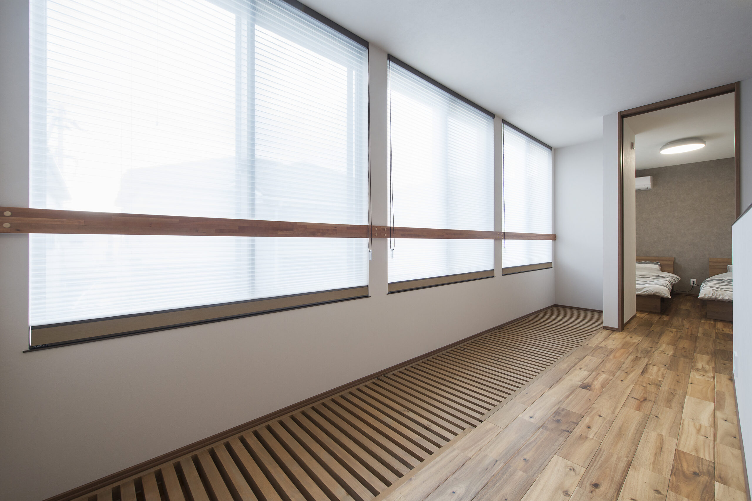 無垢床と漆喰壁の自然素材空間。 吹抜けからの自然光も心地よい
