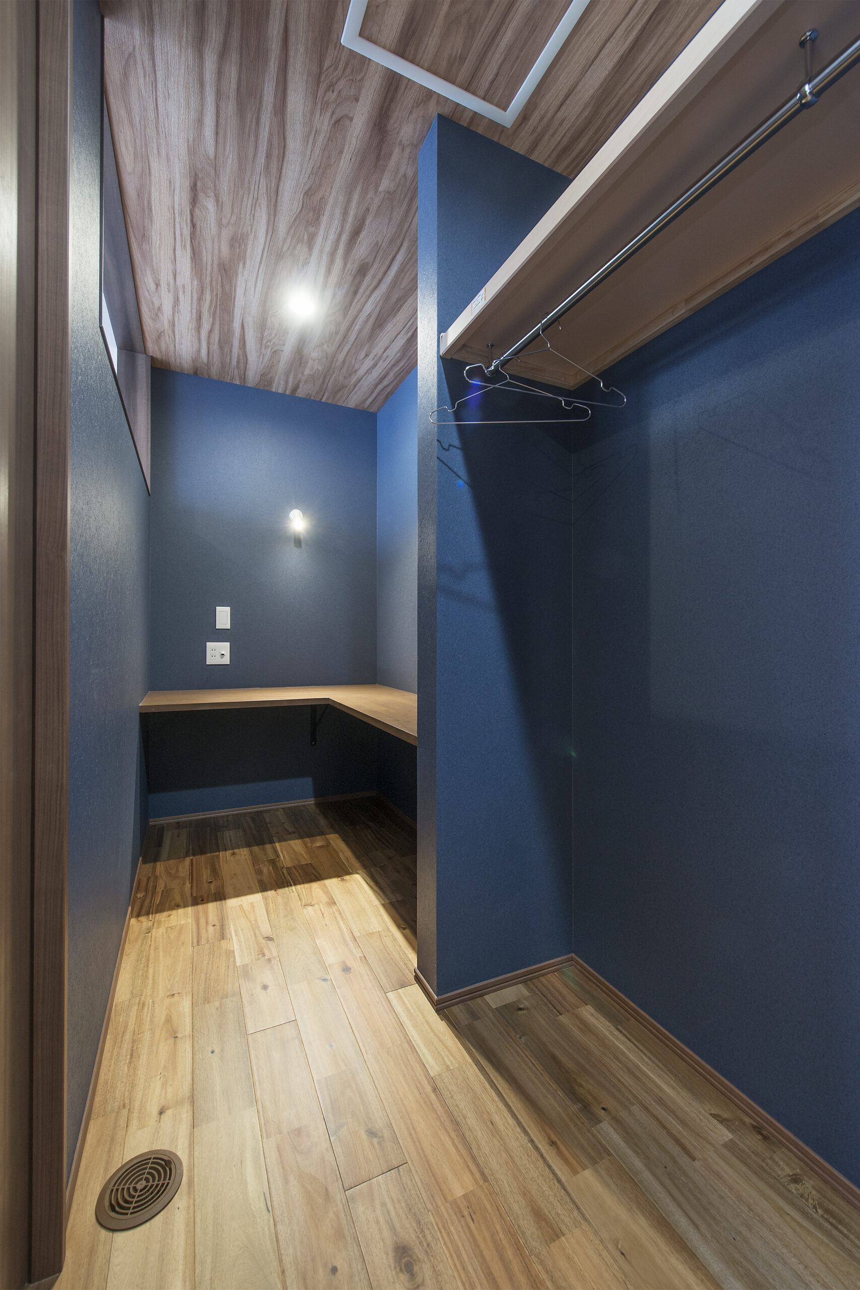 ご主人の趣味室。ネイビークロスの空間に、明り取りから柔らかな自然光が差し込む