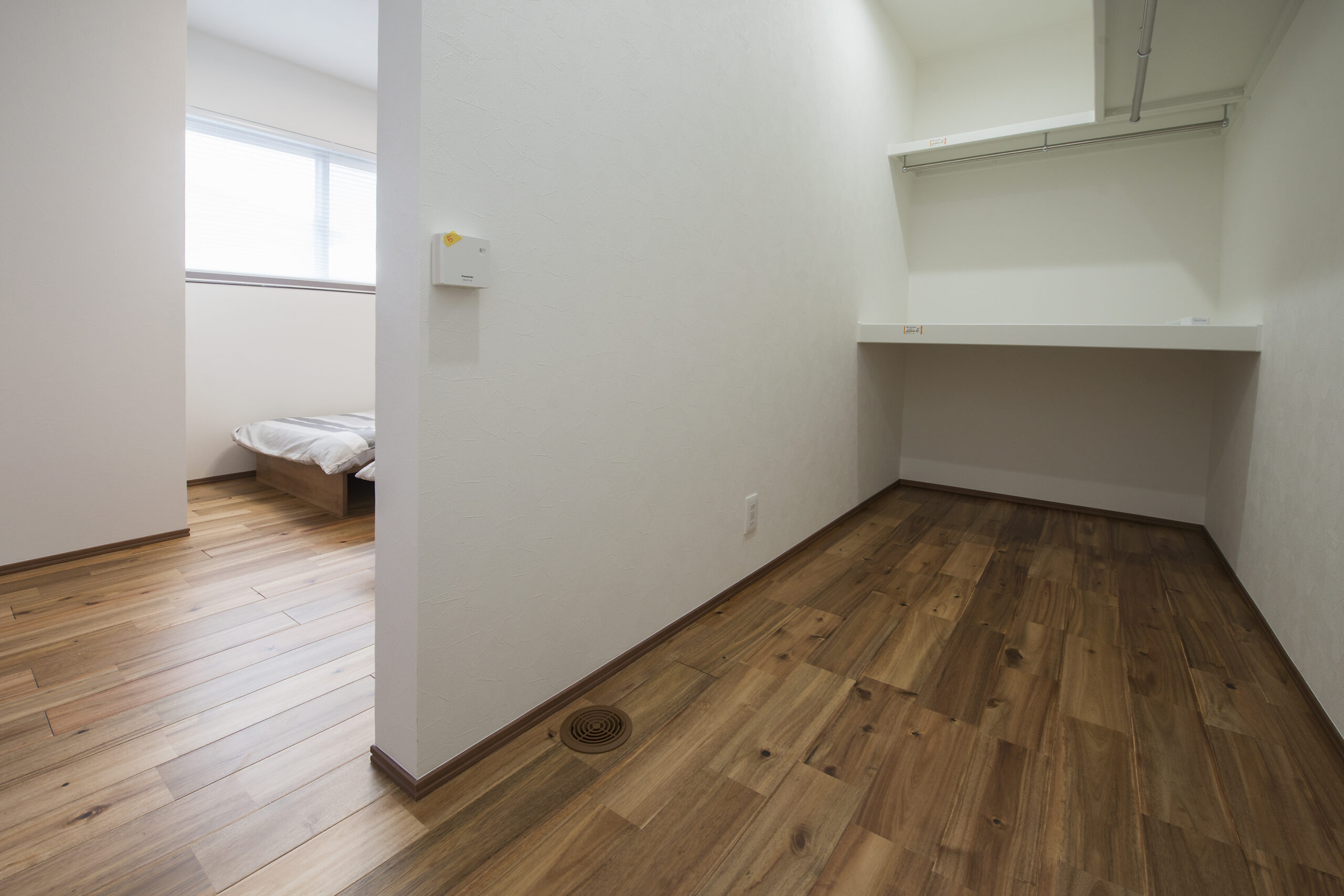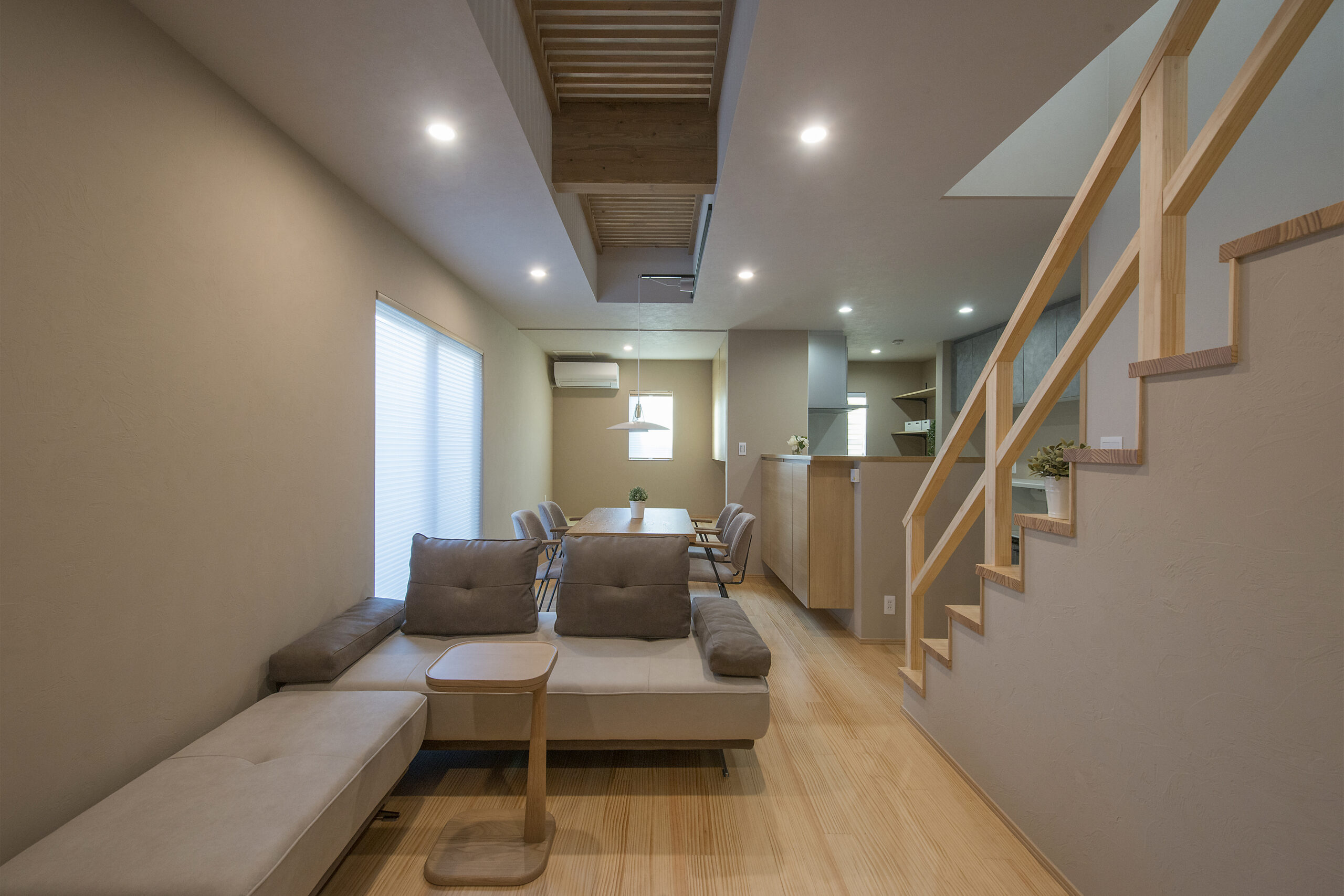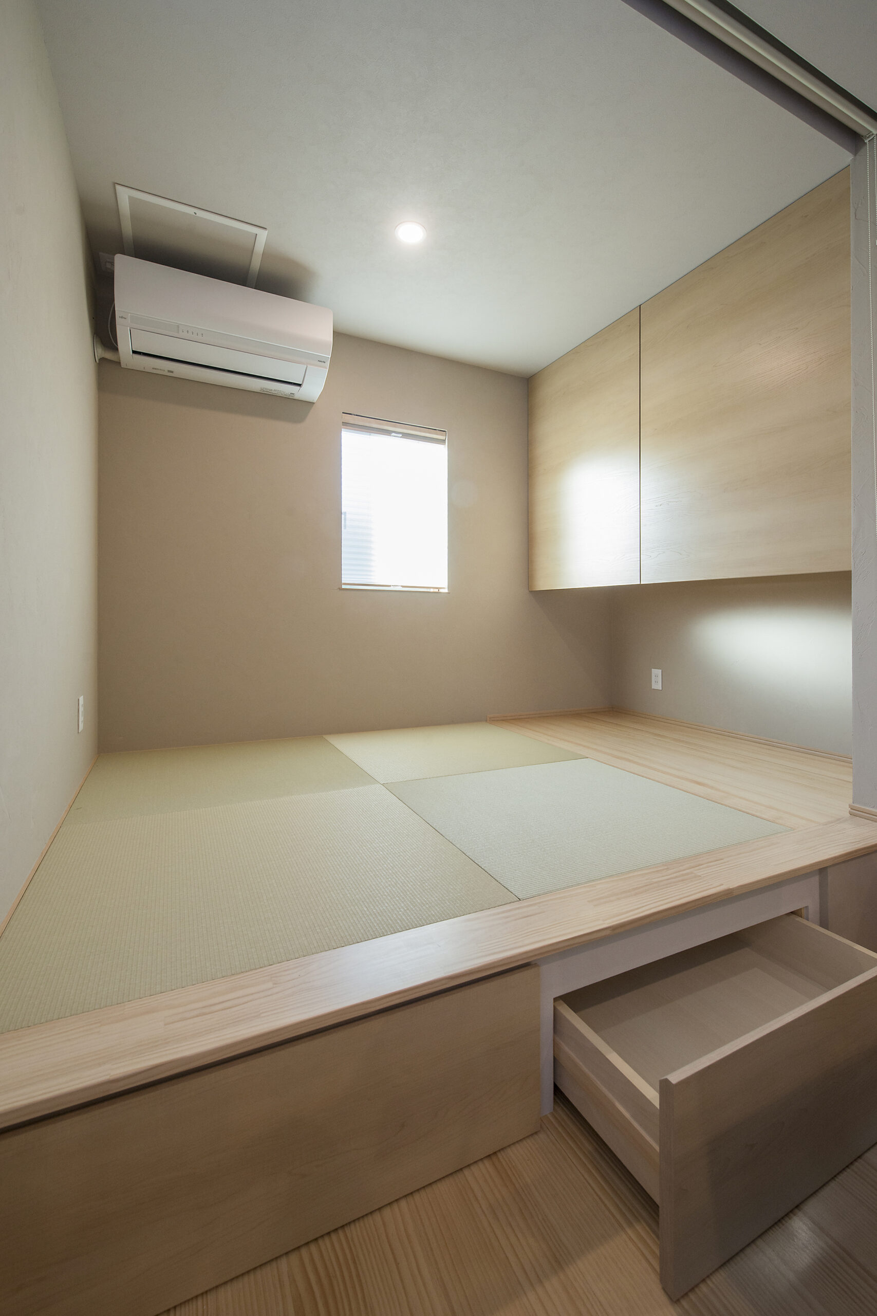 来客時に便利な小上がりの和室は、寛ぎの場としても活躍し、段差を活かした収納も確保