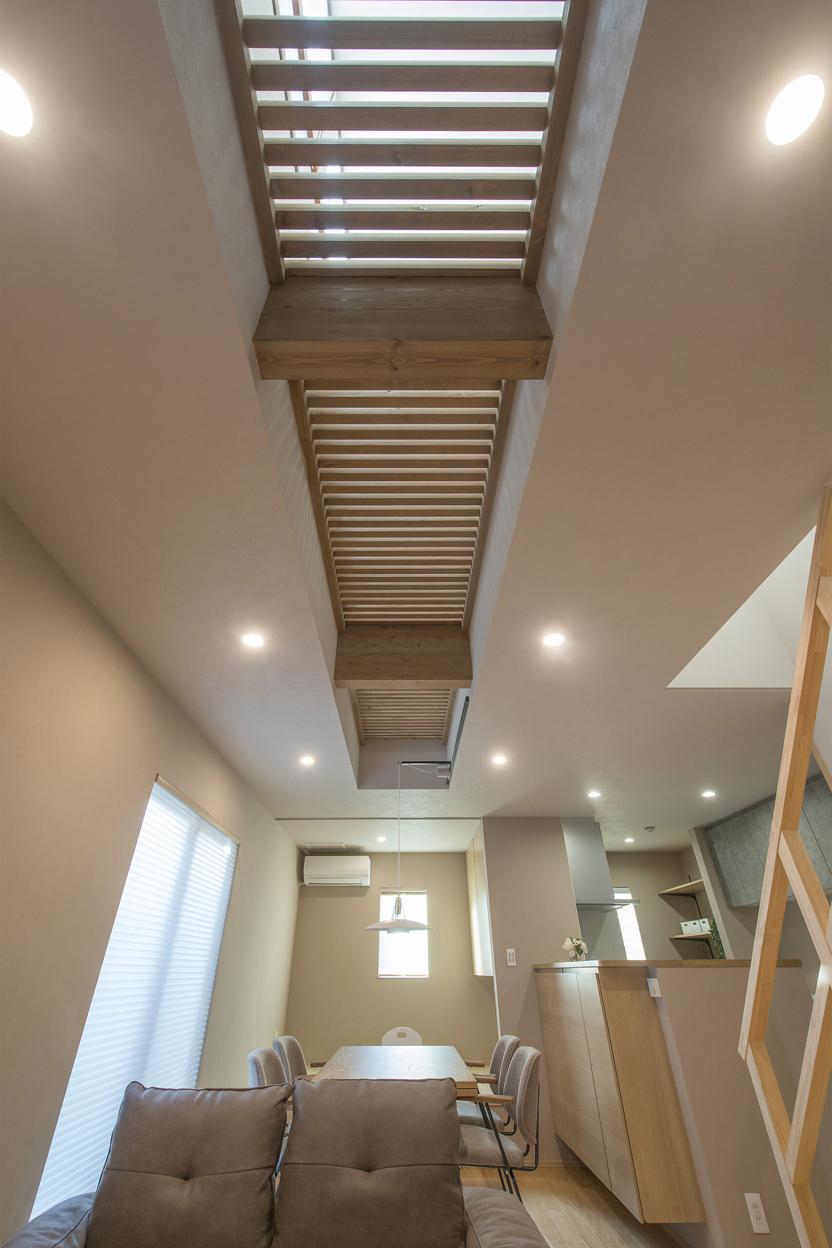 吹き抜け機能を持つ格子天井は、OB施主宅で見たキャットウォークがヒントとなった